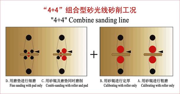 例:某公司采用“4+4”砂光组合,根据市场对板面质量要求,最后一道要求采用150#砂带,总磨削量为2.2-2.8mm。根据上述条件,首先选择砂带为40#、80#、120#、150#,再选择第五道磨削量为0.15mm(双面),第四道磨削量为0.15mm(双面,组合砂架磨垫),第三道磨削量为0.4mm(双面,组合砂架砂辊),第二道磨削量为0.5mm。第一道磨削量为1-1.6mm。